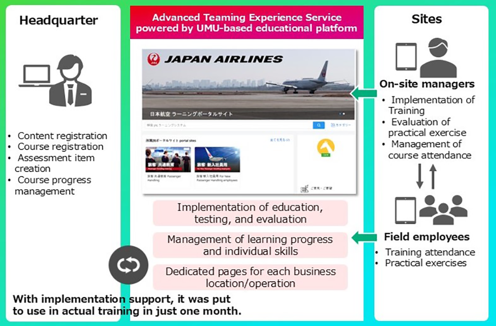 Fujitsu hat gemeinsam mit Japan Airlines Co., Ltd. (JAL) eine digitale Lernplattform entwickelt, die die Aus- und Weiterbildung an den Flughafenstandorten von JAL gezielt unterstützt. Die Plattform basiert auf der digitalen Lernlösung Advanced Teaming Experience Service powered by UMU von Fujitsu und befindet sich seit April 2025 im regulären Betrieb.