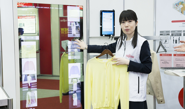 平田: 基本的にはブティックなどの店舗で使われるサービスで、来店客がハンガーにかけられた状態の服を鏡にかざすと、服に埋め込まれたRFIDタグから取得した商品の詳細情報、カラーバリエーション、そしてネットワークから取得した在庫情報などが鏡に表示されるというものです。鏡の表面はタッチパネルになっているので、お客さまは服を体に合わせながらいろいろな情報を確認できます。店舗側にとっても、試着する前段階からお客さま接点の強化を図ることができます。