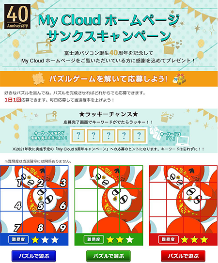 富士通パソコン誕生40周年を記念して、My Cloud(マイクラウド)ホームページ上でサンクスキャンペーンを7月7日より実施いたします。