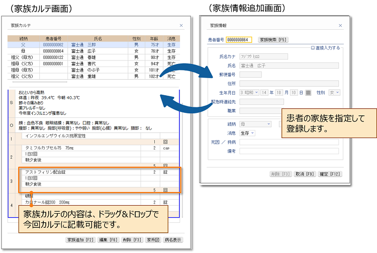 家族カルテ連動も便利な機能だと薮田氏は付け加える。「兄弟で別の日に受診した場合、他の先生が担当しているケースもあります。その際、[家族カルテ]のボタンをクリックすると、先に感染した子の検査結果、処方内容を参照できるため、薬の効果も含め兄弟姉妹間の感染ではとても有効です」。またカルテ時系列表示で前回と今回のカルテを横並びに表示し、次の方針を立てるといった使い方にも役立っているという。