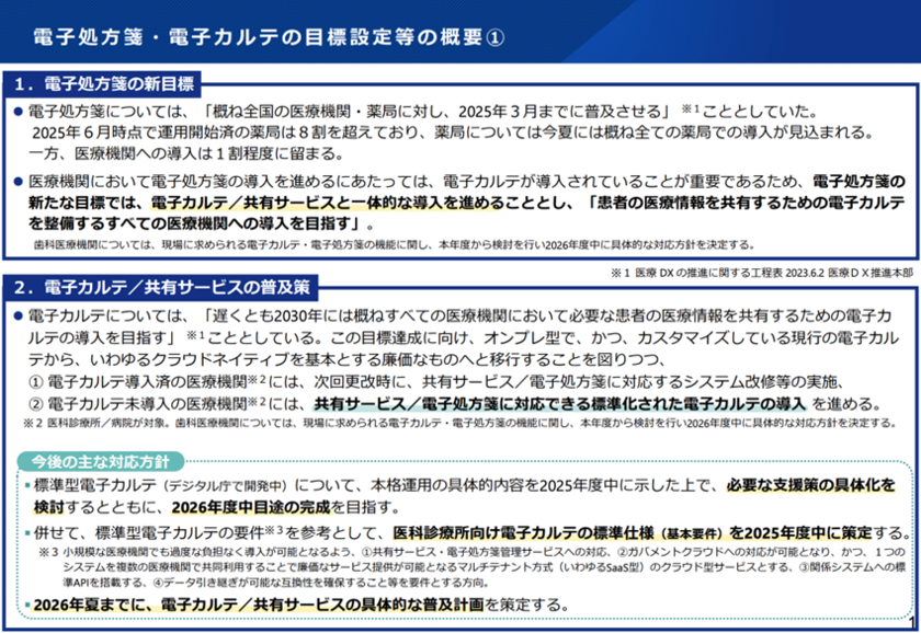 当初、政府は「2025年3月までに概ね全国の医療機関・薬局への普及」を目標としていましたが、この目標は達成となりませんでした。そのため、電子処方箋については、電子カルテ/共有サービスと一体的な導入を進めることとし、「患者の医療情報を共有するための電子カルテを整備するすべての医療機関への導入を目指す」という新たな目標が設定されました。