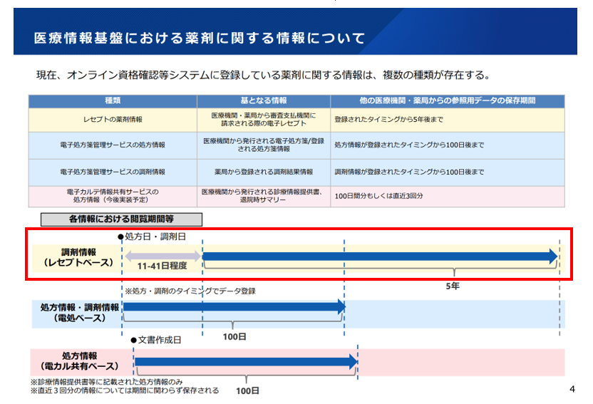 オンライン資格確認で閲覧できる薬剤情報は、レセプト情報をベースとしています。レセプトは診療月の翌月10日に医療機関から保険者に提出され、審査を経て支払基金や国保連合会のデータベースに登録されます。そのため、実際の処方から情報が参照可能になるまでに、最長で1ヶ月と10日程度のタイムラグが発生します。