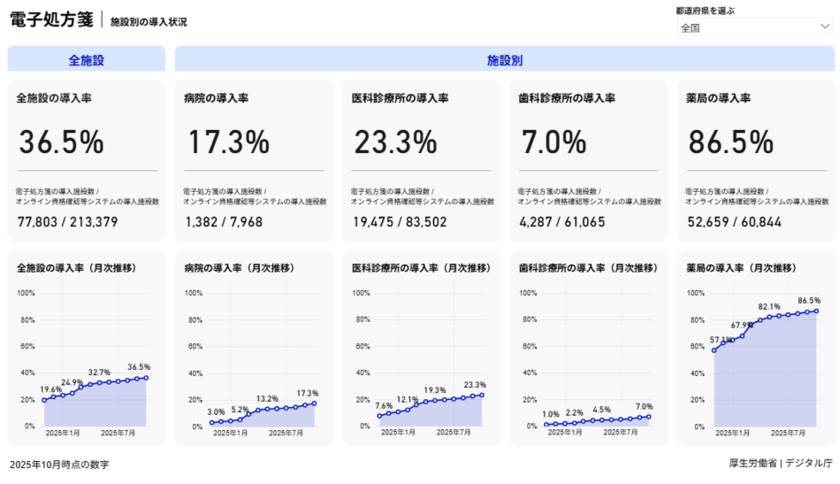 電子処方箋の運用が2023年1月に開始されてから2年以上が経過しましたが、医療機関における導入率は依然として低調です。2025年10月時点で薬局の導入率が約86.5%に達する一方、病院は17.3%、医科診療所でも23.3%にとどまっています。