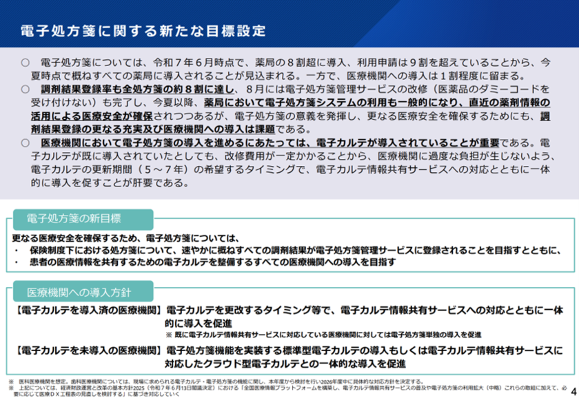 こうした状況を踏まえ、政府は2025年7月1日に新たな目標設定を行うとともに、補助金の期間延長や診療報酬上の対応など、導入促進に向けた取り組みを強化しています。