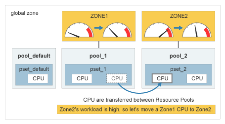 A Resource pool is a CPU allotment scheduling function that operates between specific Zones. Each Zone is assigned to just one Resource Pool and that one Resource Pool can shared by the multiple Zones. These Zones share a defined number of CPUs(processor set) under a defined CPU scheduling policy(Scheduling class).